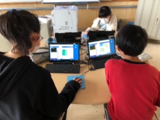 パソコン室では、八王子市から支給されたキットと購入した教材を使って6年生がプログラミングの学習をしていました。