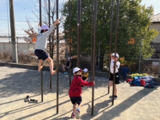 うんてい、鉄棒、ジャングルジム、登り棒、ケンステップを使って、いろいろな運動遊びに挑戦しています。遊具をしっかりと握ることから、様々な技ができるようになります。