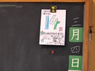 6年生の教室を見ると、黒板に『卒業まであと14日』の文字がありました。15日以前の日数のカードも、教室の入り口に掲示してありました。