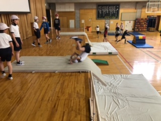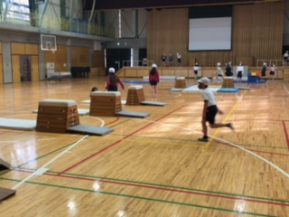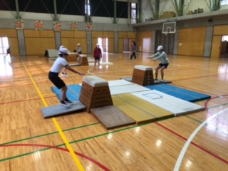 得意な技を仕上げたり、縦・横に並べた跳び箱を「せ〜の」の掛け声で同じタイミングで跳ぶ『シンクロ跳び』にも挑戦したりしていました。