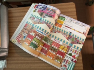 それらの果物や教科書に載っている果物を手がかりに「What do you want?」の質問に英語で答える学習を行います。