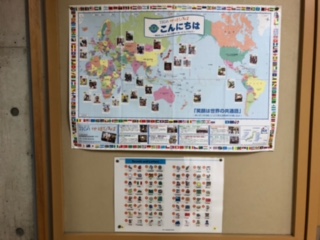 廊下側の掲示板には、世界のあいさつやアルファベットが紹介されています。