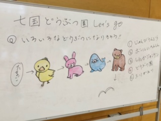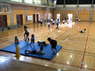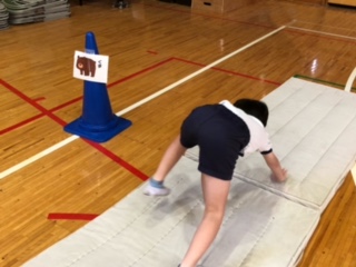 体育館では、様々な動物の動きを取り入れた運動遊びを行っています。腕支持感覚や逆さ感覚、力強い動きなど、動物の動きを真似ることで、今後の体育で培う感覚の基礎を身に付けていきます。