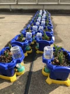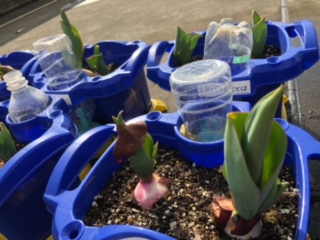 1年生の子供たちが2階テラスで大切に育てているチューリップの球根も、ずいぶん育ってきています。