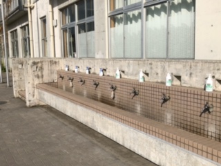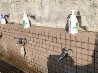 各学級での声かけはもちろんのこと、外の手洗い場にもしっかりと手洗い用せっけん、水道蛇口のレバーが設置されています。