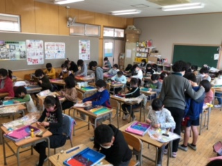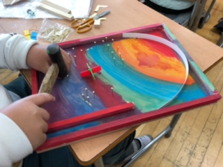 ゲーム盤の色付けが終わり、いよいよクギ打ちの作業に入りました。どごにどのようなクギを打つかで、ゲームの面白さも変わってきます。クルクルと回るプロペラも付けて、楽しいゲームとなるように工夫し集中してクギを打っています。