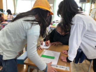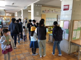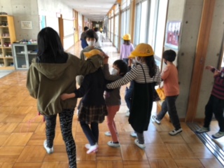 6年生が1年生の教室に寄って、なわ跳びの練習・検定に誘ってくれています。6年生に誘われた1年生は、ニコニコでついていきます。