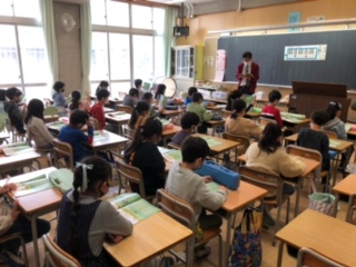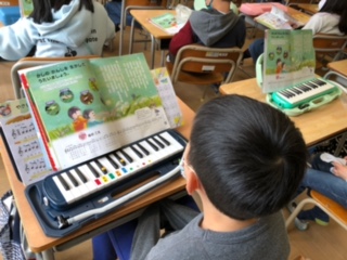 ?この1年間に学習した曲を振り返っています。歌っているのは「虫のこえ」です。秋に様々な虫の鳴き声を真似しながら、楽しく歌ったことを振り返っていました。