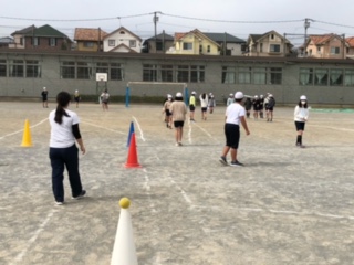 チームごとに作戦を考え、対戦します。試合の始めと終わりにはしっかりと挨拶をしていて、立派です。