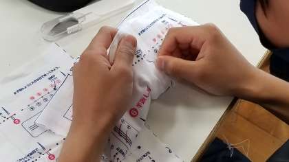 5年生が練習布を使って、「返しぬい」「半返しぬい」にチャレンジしていました。
