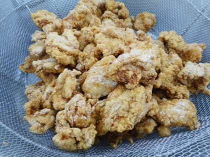 カラッと揚げたら出来上がり!!4月にも鶏の竜田揚げが出ましたが、からあげは何度出てもうれしいようです。廊下で「今日の給食なんですか?」と聞かれることが多く、この日は「鶏のからあげだよ」と伝えると飛び上がってよろこんでいました。児童のみなさんによろこんでいただけるように調理員さんは外はサクサク中はジューシーに心を込めて作っています。