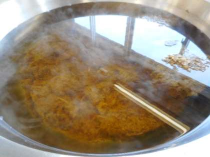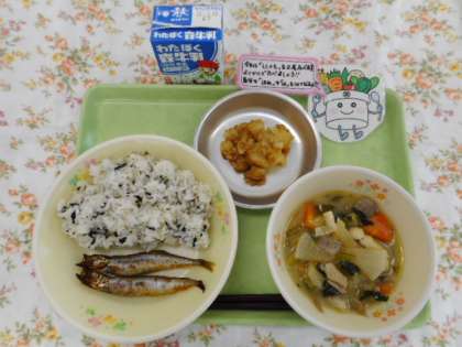 10日の給食はわかめごはん、ししゃものカレー焼き、じゃがいものごまおかかバター、みそけんちん、牛乳です。みそけんちんのだしは2キログラムのけずりぶしでとりました。ざるで漉しますが、とてもきれいなだしがとれます。