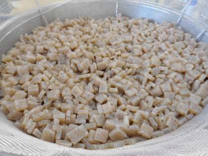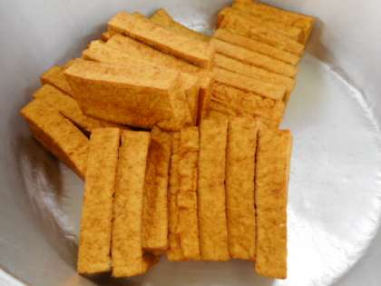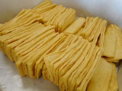 八王子市では地元の業者さんにご協力いただき、給食を提供することができています。お豆腐屋さんには豆腐を始め、油揚げや生揚げ、こんにゃく屋さんも糸こんにゃくや白滝、またいろいろな形で納品していただいてます。この日は汁物用に小さめです。