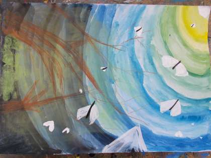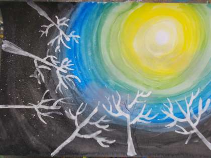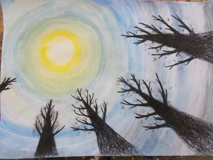 パステルやコンテ、胡粉や墨汁を使って周りの様子を想像して描き加えました。幻想的な世界が画用紙いっぱいに広がりました。