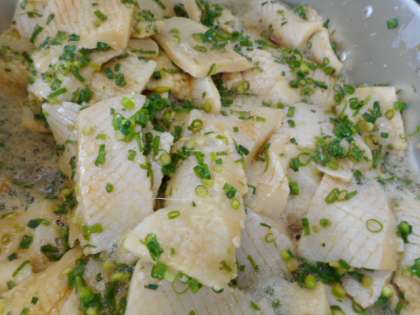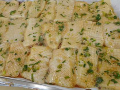 給食では「いか」が多く登場します。給食のいかは柔らかいのが特徴の一つでもあります。いかの切り身にこねぎや調味料でしっかり下味をつけます。鉄板に並べる際はできる限り下味に入れた野菜も上からかけて焼きます。