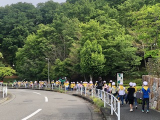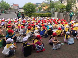 4月14日(金)今日は1年生の遠足です。歩いて宇津貫公園に向かいます。歩き方が上手です。月曜日の交通安全教室の学びが生きています。
