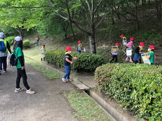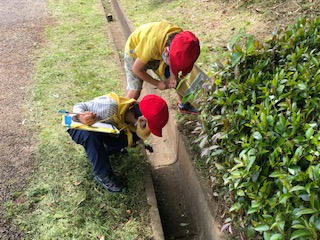 宇津貫公園での探検のようすです。クモを見つけた子、セミの抜け殻を見つけた子、さまざまな色や形の花や草の絵を描いている子など、気付きは実に多様です。