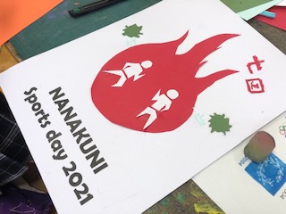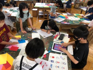 歴代のオリンピック・パラリンピックエンブレムの形や色に注目し、込められた思いや意味を知るところから学習が始まりました。写真は七国小学校の運動会を表すエンブレムを考えて制作している場面です。