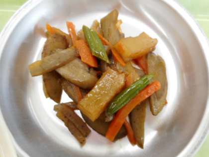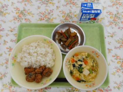 14日の給食はじゃこごはん、かつおの竜田揚げ、きんぴら、かきたま汁、牛乳です。きんぴらにはごぼう12キログラム、にんじん8キログラムを使いました。機械を使わず全て手きりです。出来上がりのおいしさが違います。調理員さんの心遣いが味にあらわれているようなやさしい味です。かきたま汁もたまごがふんわりしていてやさしい味です。今日の給食は残りがとても少なかったです。