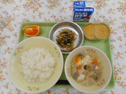 20日の給食はごはん、ぎせい豆腐、野菜のごまおかか和え、呉汁、果物(清見オレンジ)、牛乳です。給食前に「今日の給食はなんですか?」と聞かれました。「白いごはんに・・・」と始めると「私、白いごはん大好き!!」と答えてくれました。給食では野菜を多くとるようにするため混ぜるごはんや炊き込みごはんが多くなりがちです。しかし、食育の観点から白いごはんを1週間に1度は出せるようにしています。ごはん、おかず、汁物、ごはん・・・など1点に集中して食べるのではなく、いろいろな献立を少しずつ食べるようになってほしいなと思っています。野菜のごまおかか和えには「かつお節粉」を使っています。野菜と和えることで野菜から出る水分がだしの役割を果たしてくれる素晴らしい食材です。