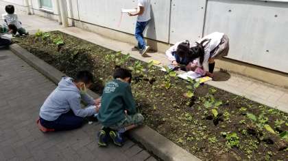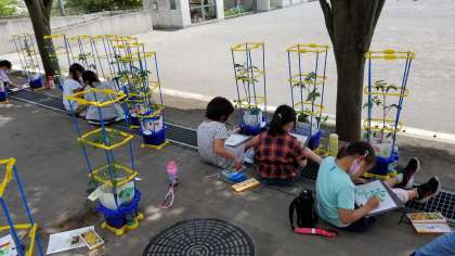 2年生が生活科の学習で、野菜の観察をしていました。1人1つのプランターに育てているミニトマトの他に、学級園で育ているナス、ピーマン、トマトも観察をしていました。