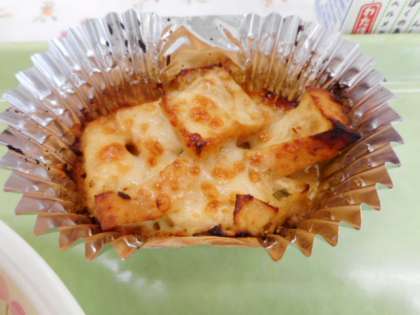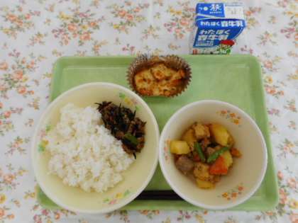 26日の給食はごはん、ひじきの炒め煮、厚揚げのチーズ田楽、いりどり、牛乳です。