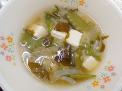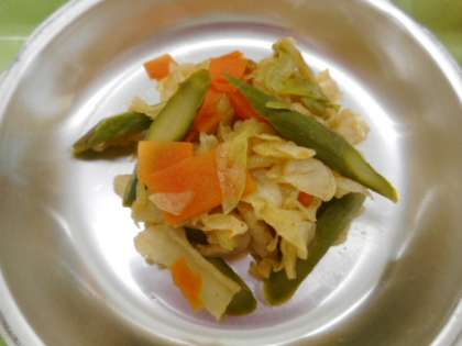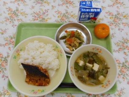 27日の給食はごはん、鯖の味噌焼き、グリーンアスパラの炒め物、みそ汁、果物(冷凍みかん)、牛乳です。