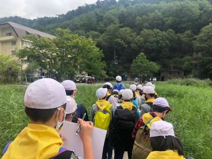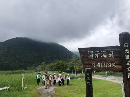 湯の湖から湯滝に向かいます。クラスを2つに分けてそれぞれにネイチャーガイドさんが付いています。湯元温泉特有の匂いはマスク越しでもはっきりと分かります。「湯の湖、湯滝、湯元温泉、湯川、今日のキーワードはお湯ですね」とネイチャーガイドさんのお話が始まりました。説明くださるポイントはガイドさんによって異なるようです。子供たちは一生懸命にメモをとっていますが、書きながら歩くのはやめた方が良いと助言をいただきました。自然のようすを全身で感じながらのハイキングになりそうだと期待が高まります。
