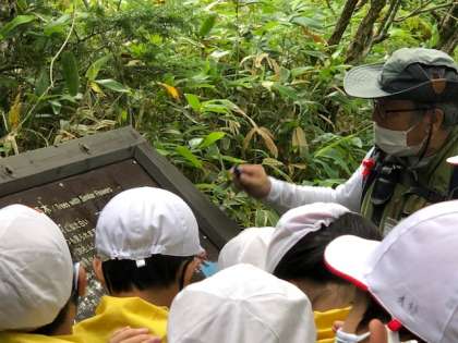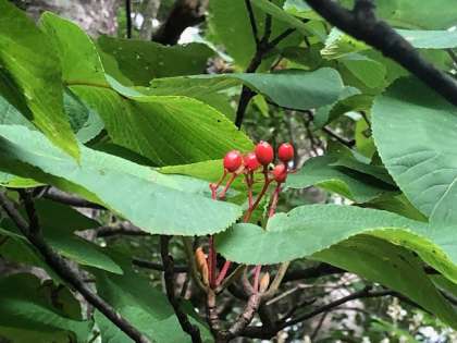 左の写真は赤い実が色づき始めたオオカメノキ、中央はその説明を受けている場面です。右の写真はミヤコザサの説明場面です。触れることができる植物は手触りを確かめるよう勧めていただきました。鹿の害があるエリアはササが食べられてしまっていることも知りました。