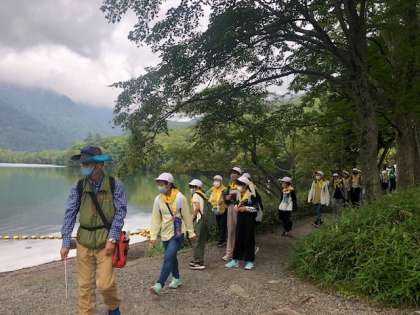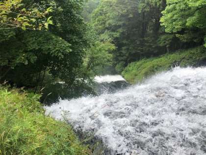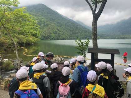 湯の湖では釣りをしている人が多くいました。歩道には道の端に黒いパイプが通っていました。ネイチャーガイドさんに促されて触ってみると、とても温かく、中をお湯が流れている音がしました。「湯の湖・湯滝・湯川は温かいのか冷たいのか」と疑問が湧いてきました。いよいよ湯滝の上の場所に着きました。湯の湖から流れ落ちる水の勢いに驚きながら、湯滝に向かいます。
