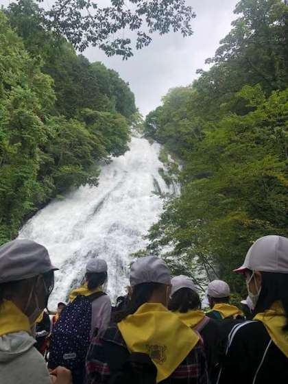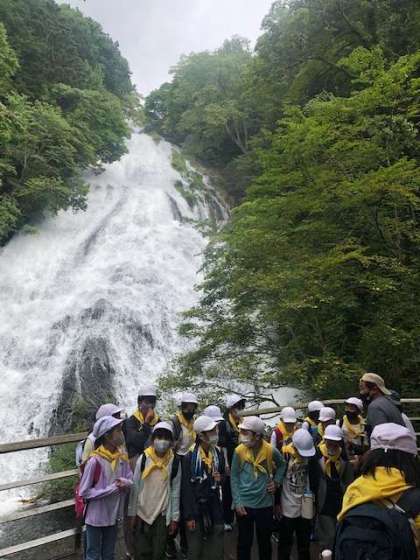 物凄い勢いで流れ落ちる湯滝の前でハイキングのグループごとに記念撮影をしました。なかなか滝の前を離れることができず、いつまでも見ていたいという気持ちでみんなしばらく立ち尽くしていました。