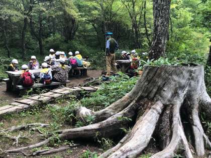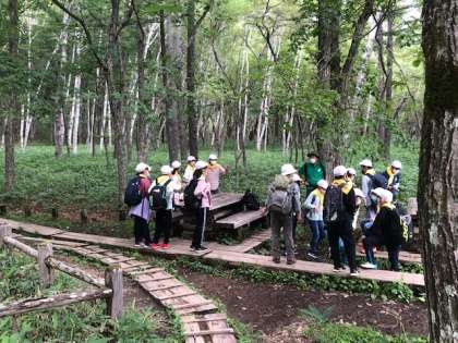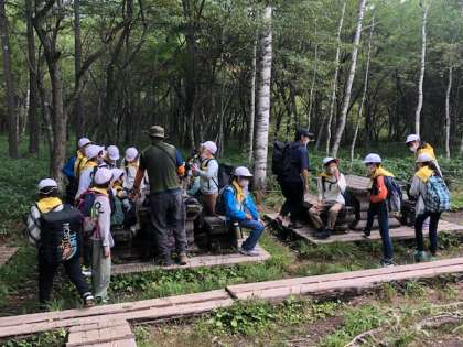 泉門池(いずみやどいけ)で給水タイムの小休止をとりました。塩分補給のタブレットを班長がみんなに配布しました。泉門池は湧き水で潤っているそうです。