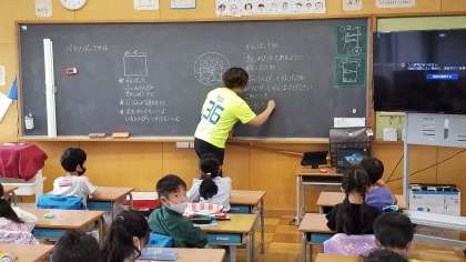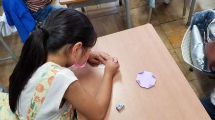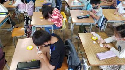 折り紙でメダルを作り、後ろにメッセージを書いています。