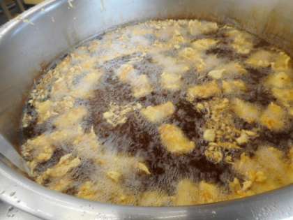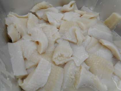 天丼のもう一つの具は「いか」です。「いか」にも衣をつけて、さつまいもを全て揚げてから揚げ始めます。