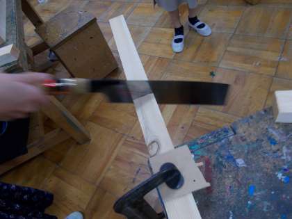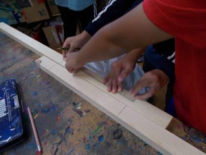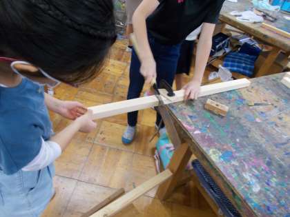 4年生の時に学習した「両刃のこぎり」を使って、瓦桟を切って土台をつくります。引く時に力を入れたり、角度を調整したりして学んだことを生かしながら正しく安全に扱うことができました。