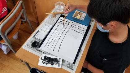 今日は、1時間だけなので、筆の持ち方を教えてもらい、まっすぐ線を引く練習をしました。明日、本番のようです。