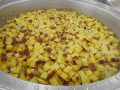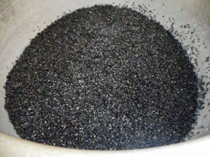 ふっくら炊き上がりました。このさつまいもごはんにかける「ごま塩」も給食室で手作りです。黒ごまに塩と少量の水を加え、ごまの表面に結晶化させます。