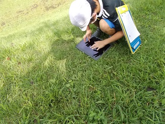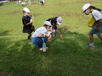 3年生は「昆虫の成虫の体はどんなつくりになっているのだろうか」という学習のめあてをもって活動しました。写真はいずれも3年生の学習のようすです。タブレットを活用している子もいました。トノサマバッタやショウリョバッタの成虫はとても大きくてびっくりしていました。観察後は、もちろんリリースしていました。今後、1年生や2年生も公園探検や虫探しに来る予定です。大事な大事な昆虫です。