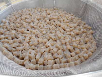 こんにゃくもサイノメに切ります。調味料で煮含めてできあがりです。大豆やたくさんの野菜を箸でつまみ、箸の練習を楽しみながら食べることができる栄養満点の献立です。