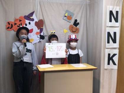左の写真は、9月14日(火)の児童集会のようすです。いつも代表委員会が発信している「NNKニュース」に「あいさつ苦手星人」が登場しました。