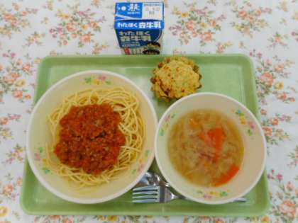 15日の給食はスパゲティーミートソース、キャベツとベーコンのスープ、スイートポテト、牛乳です。今日はみなさんに大人気のメニューが勢揃いでした。ある女の子のお話です。「今日はどれからおかわりしようか迷っちゃう」とのことでした。おかわりをするルールがクラスで決められているそうで、どれからおかわりしようかと悩んでいるそうです。「よく考えて決めてね」と伝えると「うん」と食べることが待ちきれない様子で教室へ戻って行きました。給食をおかわりのことで悩みながら食べていただけるのは作っている側からするととても幸せなことです。本当に残りが少ない日でした。その女の子は何を一番におかわりできたでしょうか?