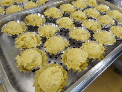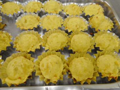ミニマドレーヌカップに分けて、オーブンでこんがり焼きます。外はさっくり、中はしっとりしたおいしいスイートポテトに仕上がりました。