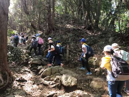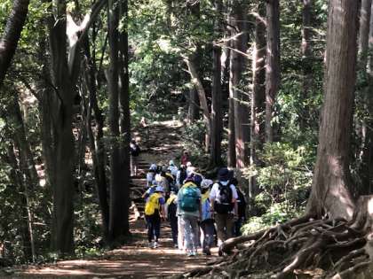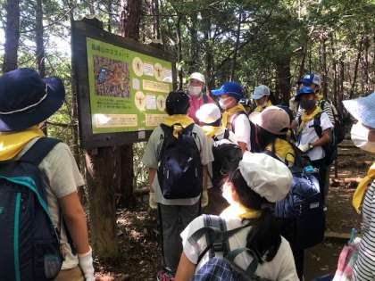 なだらかな登り坂から結構な勾配の道へと一歩一歩慎重に進みます。途中途中でインストラクターのお話を聞きながらの登山です。中央の写真はスズメバチについての注意を聞いている場面です。