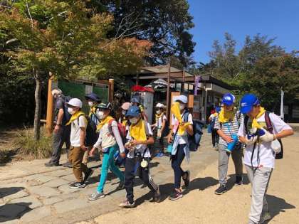 急な登り坂をよくがんばって歩きました。励まし合い、学び合いながらの往路でした。ようやく到着した高尾山の山頂です。