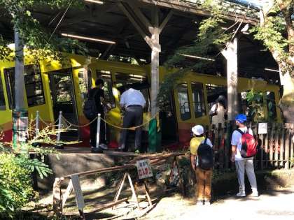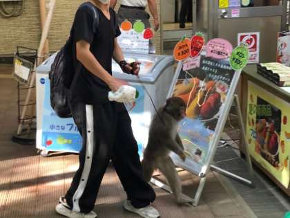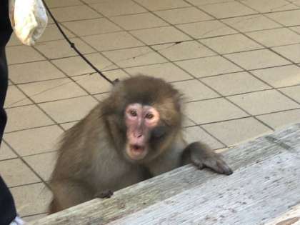 まもなくゴールの清滝駅ケーブル乗車前広場です。ふと見るとケーブルカーからお猿さんが降りて来ました。上手な二足歩行に子供たちはびっくり仰天です。芸を習得したお猿さんでした。大サービスで宙返りを何度もして見せてくれました。