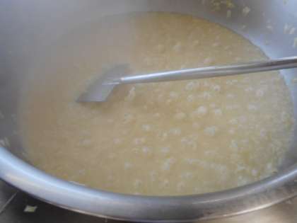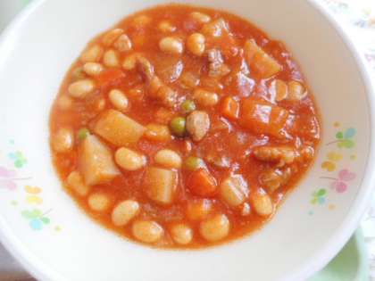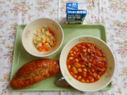 2日の給食はガーリックフランスパン、ポークビーンズ、コールスローサラダ、牛乳です。ポークビーンズにはたくさんの大豆と野菜を入れて作ります。大豆の大きさに合わせて食材を切りそろえています。たまねぎはよく炒めて作ります。