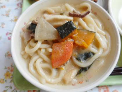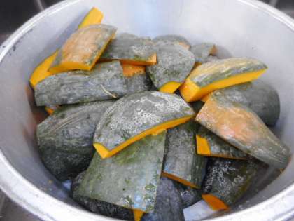 9日の給食はほうとううどん、じゃがもち、アーモンド黒糖、果物(みかん)、牛乳です。ほうとううどんの「ほうとう」とは山梨県を中心とした地域の郷土料理として有名です。小麦粉を練り、ざっくりと切った麺を野菜などの具材とともにみその汁で煮込んだ料理です。「ほうとう」は一般的に平たい麺のことが多いのですが、必ずしも麺の状態ではなく「すいとん」のような団子にすることもあるそうです。「ほうとう」と「うどん」の違いは「ほうとう」は作るときに「塩」を入れないで作るそうです。煮込んでいると「こし」がないので、だんだんと溶けてとろみがついた汁になってくるそうです。給食では「ほうとう」のかわりに「うどん」を使いました。一緒に入れた「かぼちゃ」は八王子市小比企町産の万次郎かぼちゃです。切った状態での写真となってしまいましたが縦に細長い立派なかぼちゃでした!