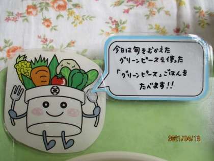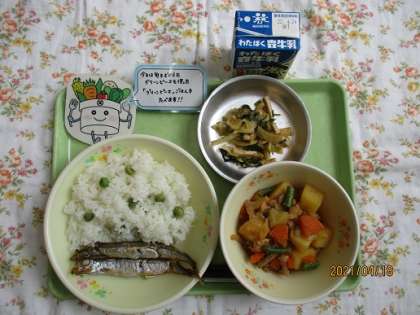 18日の給食はグリーンピースごはん、焼きししゃも、肉じゃが、おひたし、牛乳です。今日は今が旬の「グリーンピース」を使って「グリーンピースごはん」を作りました。本来であれば、2年生にグリーンピースのさやむきをお願いするところですが、感染症の影響で残念ながら実施することができませんでした。
