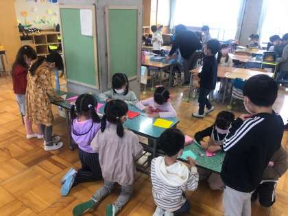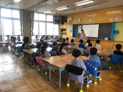登校して荷物の整理ができた子から「のんびりタイム」が始まっています。折り紙をしたり、読み聞かせコーナーでお話を聞いたり、友達や担任と話をしたりなど、それぞれ思い思いに「七国小の学校生活」をスタートしています。