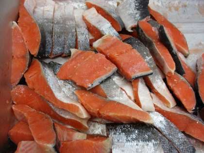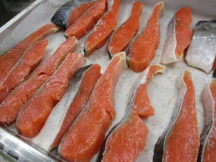 給食の鮭はおいしい!と評判です。地元のおいしい魚屋さんから納品していただいています。生の状態でも脂がのっていることがわかります。